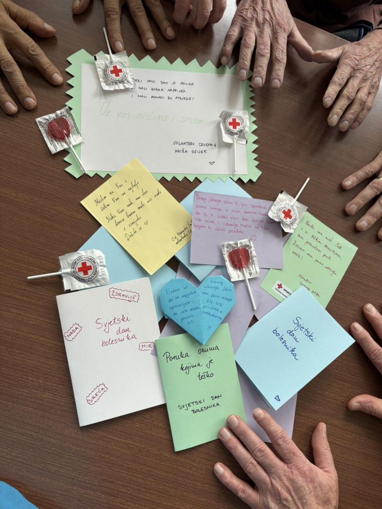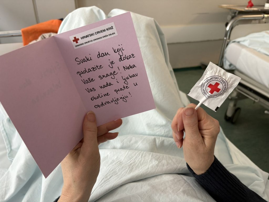 Ravnateljstvo Kliničkog bolničkog centra Osijek posjetili su volonteri Gradskog društva Crvenog križa Osijek te su pomoćnici ravnatelja za sestrinstvo – glavnoj sestri KBC-a Suzani Luketić, mag.med.techn. uručili vlastoručno izrađene prigodne poruke uz želje za bržim oporavkom i ozdravljenjem. Motivacijske poruke podijeljene su hospitaliziranim bolesnicima KBC-a Osijek.